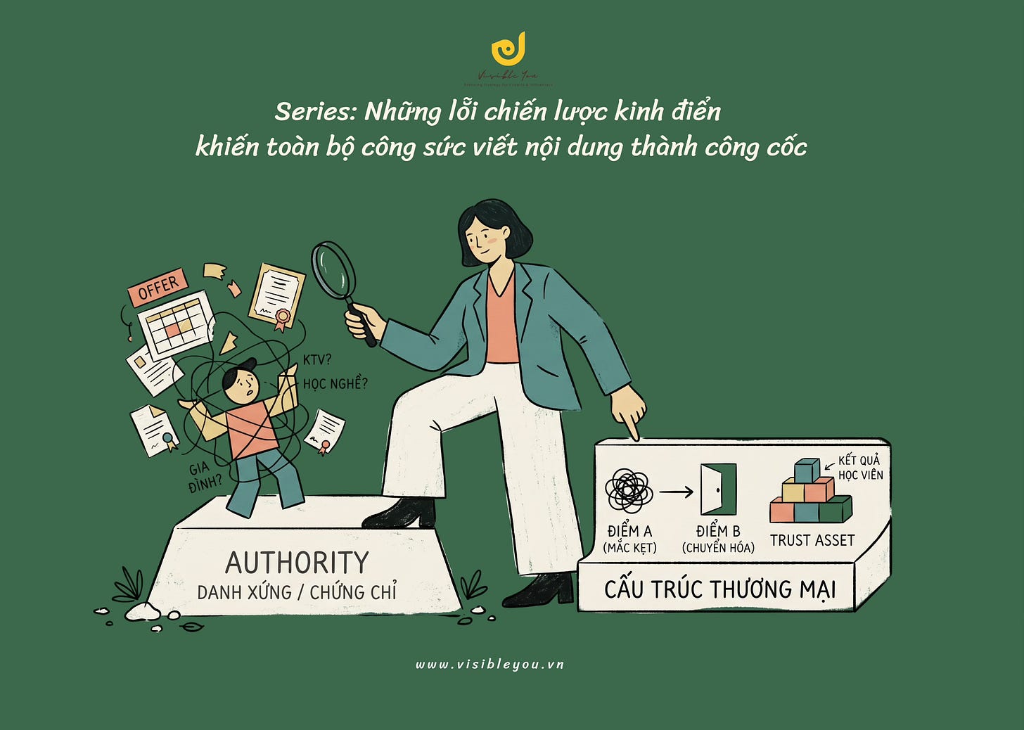 Authority hiện đang dựa vào bằng cấp và chức vụ thay vì kết quả của học viên. Trong khi, trong mắt người mua, hai thứ này khác nhau. Khi chưa có proof cụ thể về kết quả học viên, rất khó thu hút họ mua, hoặc tăng giá, khó mở rộng nhóm khách cao cấp hơn, và khó khiến landing page tự thuyết phục.